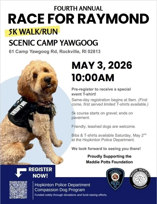In November 2022, the Hopkinton Police Department welcomed Raymond, a 10-week-old Goldendoodle, and launched their Compassion Dog Program to strengthen community connections and provide support to those in need. Funded entirely through donations and fundraising efforts, the program has made a meaningful impact across the community—and we are incredibly grateful to be a beneficiary of this event.